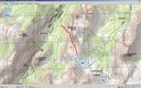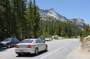 よく見かけるTioga Road沿いに駐車した車です。写真右のドームはPywiack Dome、中央の高い山はTenaya Peak。Tenaya Lakeの北端から約1.5マイルほどの地点です。偶然見つけたのですが、奥に止まっている白い車のすぐそばには小さなケルンが積んであり、そこから下の地図に示した紫の線のような感じで、しっかりとした踏みあとが出来ていました(終端は確認していません)。その先南東側の岩壁の裾野には、かすかななトレイルが出来ています。どうも岩登りをする方たちの岩壁へのアプローチトレイルのようです。面白いのはTenaya LakeからTuolumne Medowsへとのびる公式トレイル(地図上の点線)よりしっかり使い込まれていることでした。