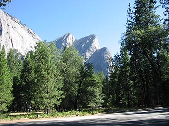 ここは左にエル・キャピタン、右にカシドラル・ロックをのぞむ素晴らしい展望ポイントです。 このポイントはヴァレーの北側を走る道路「ノースドライブ」のマーセド川沿いにあります。ノースドライブは西行き一方通行ですので、ヴァレーを「出る」際に立ち寄ることになります。朝は逆光になりますので午後がお勧めです。