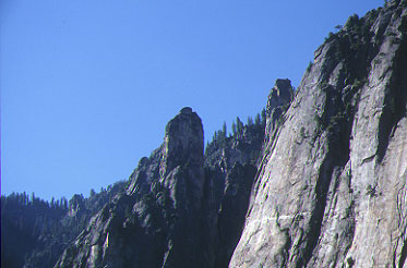 「カシドラル」はキリスト教の大聖堂です。隣にある「カシドラル・ロック」とこの「カシドラル・スパイアー(尖塔)」の姿があたかもそのように見えることから名付けられました。この2つの塔は、谷底から590mと654mの高さにそびえ立っている花崗岩です。