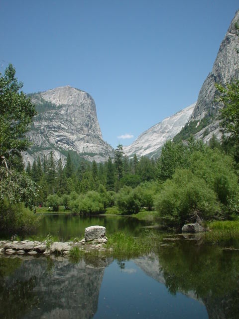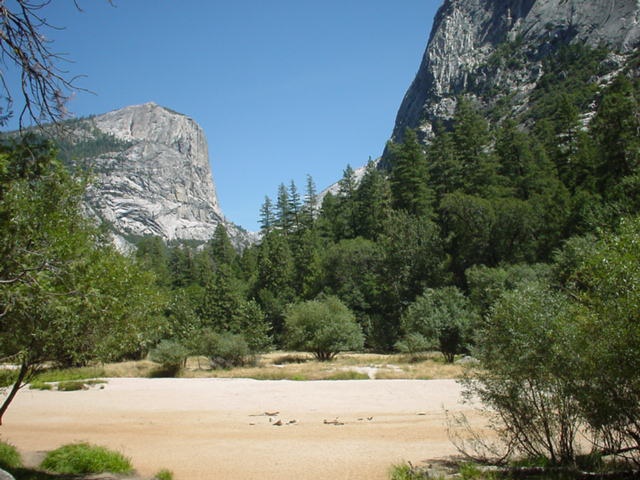 ヨセミテ国立公園の中で、意外に「行ってみたい」と要望の高いのがミラー・レイクです。「湖」という名前から、きれいな水に、山が美しく映っているというイメージがあるのかと思います。実際には、これは「湖」ではなく、「プール」(池、水溜り)に近い状態のもので、夏に行っても水がない場合が多いです。上の写真は、昨年2004年8月上旬に訪れた時のもの。まったく水がなく、池底を歩いてました。