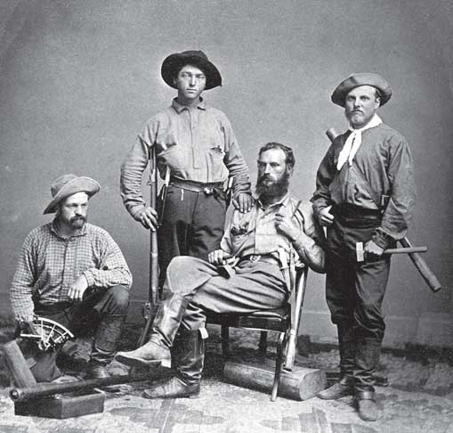 写真:The 1864 field party of the California Geological Survey (Charles Hoffmann absent). From left to right: James T. Gardner, Richard D. Cotter, William H. Brewer, and Clarence King. Gardner is holding a sextant used for mapping and astronomical location; Cotter is armed with musket, dagger, and pistol; both Brewer and King have mercury barometers - used to measure altitudes - slung on their shoulders; and King holds a geologist's hammer. (U.S. Geological Survey Library)