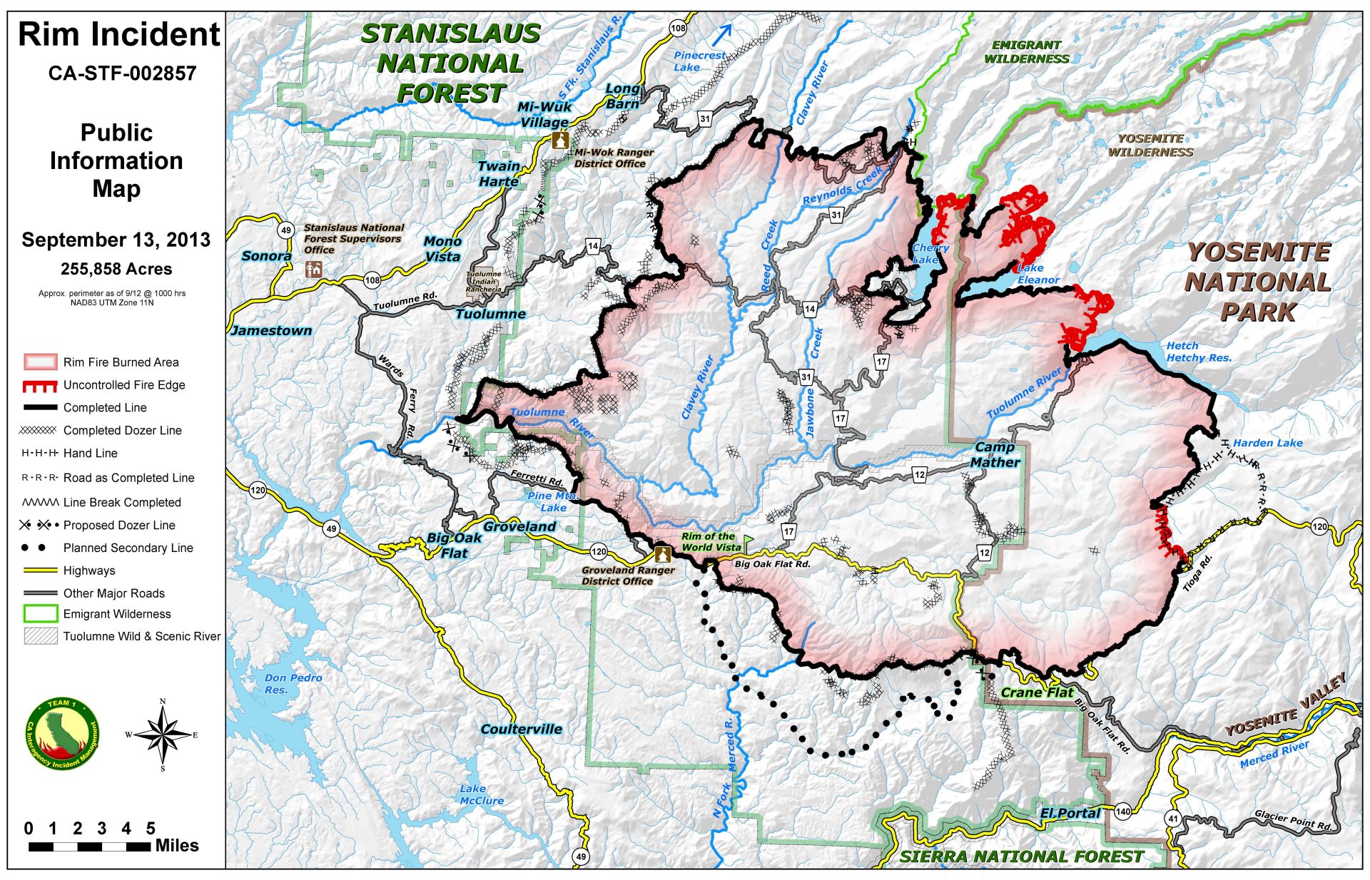The Rim Fire began Saturday, Aug. 17, 2013, on the Stanislaus National Forest near the area known as Jawbone Ridge. The fire has burned 237,341 acres and is 80 percent contained.