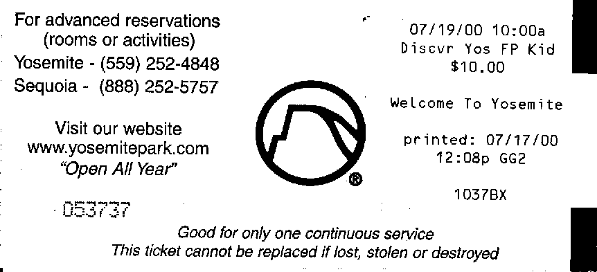2000年7月19日(水)午後に Direcover Yosemite Family Program に参加しました。国立公園局のページの Yosemite Guides 新聞に開催スケジュールが載っていたので、事前にスケジュールすることができました。ただし予約は現地 (あるいは電話) でしかできないので、Yosemite Valley ストアの裏にある Tour の看板のあるツアー デスクでチケットを購入しました。子供一人 $10 で、親は無料です。