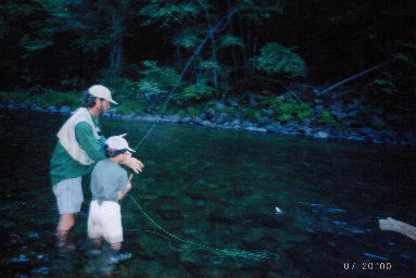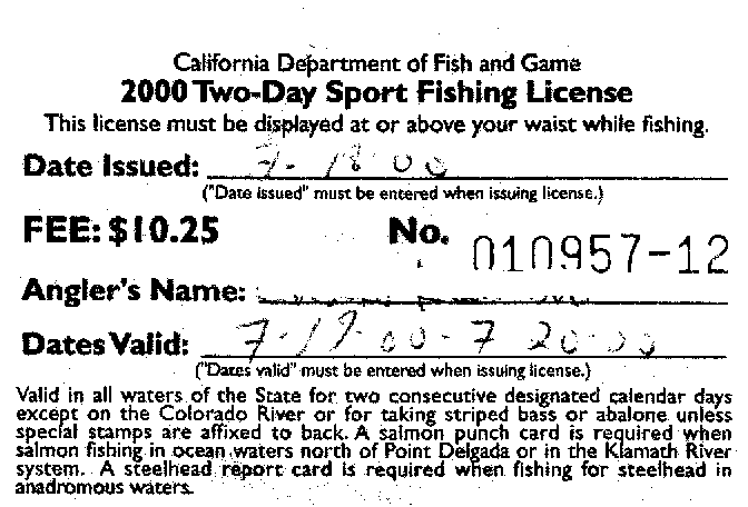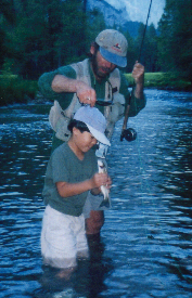 2000年7月20日(木)午後に Yosemite Guides Fly Fishing に参加しました。「フライ フィッシングのインストラクターを半日雇いました」という表現の方がより正確かもしれません。Yosemite Guides は Yosemite View Lodge (El Portal) にオフィスがあり、私達は今回 Yosemite View Lodge に宿を取ったので、そのままピックアップしてもらって現地に連れて行ってもらいました。半日コースで最初の 1 人が $150、最大 3 人まで 1 人追加するごとに +$50、子供は +$25 と比較的高価なプログラムです。道具はもちろんセットですし、私達は 2 日間のライセンスを事前に購入しました ($10.25 Yosemite Valley の スポーツショップで売っている)が、Yosemite Guides の方で用意されていました。