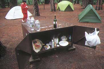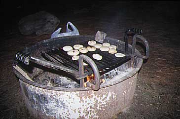 これもサイトごとに装備されているファイアープレイスです。鋳物製のバーベキューグリルも付いている。これが高さも調整できるすぐれもので、焼き物には重宝します。(写真は何を焼いているのでしょうね?ひ・み・つ?)