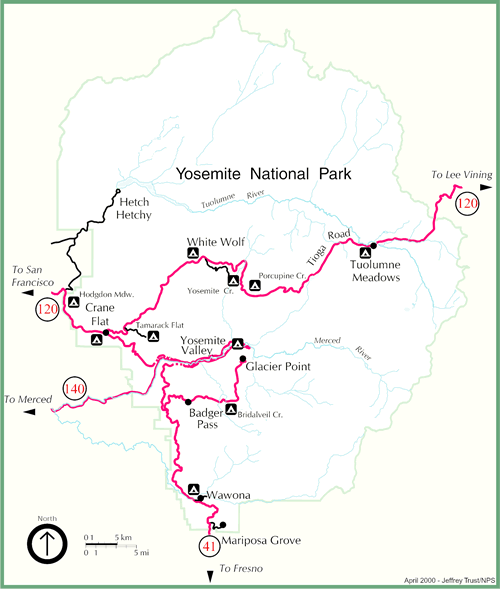 公園の北半分へのアプローチは難しい。Hetch Hetchy(ヘッチ・ヘッチー)渓谷に車道がついている他は徒歩によるしかない。(ここにはダムが造られ、サンフランシスコ市の水源となっている。)