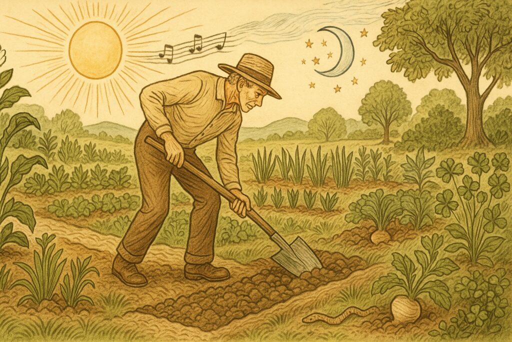 チャドウィックの園芸思想において、耕作とは単なる土の物理的操作ではなく、宇宙のリズムと調和する時間芸術である。講話『Cultivation』では、太陽の角度、季節の移ろい、露や霜の発生など、天体と地球の動きが生み出す自然の律動に注意深く耳を傾け、そのタイミングに即して行う耕作こそが、生命力に満ちた土壌と作物を育む鍵であると説かれる。とりわけ彼は耕作の“季節的適時性”を強調しており、深耕や整地といった土壌の構造を大きく変える行為は、太陽の力が弱まり、植物の活動が休止する冬季に行うべきだと述べている。