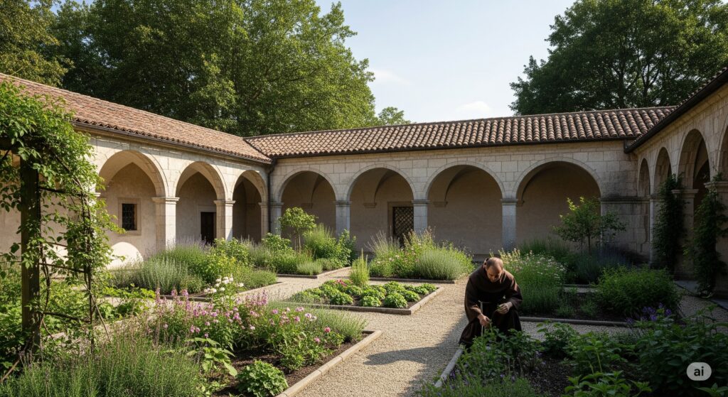 修道院の薬草園は、修道士たちが薬草の栽培・調剤を通じて神の意志と自然の法に触れる空間として位置づけられていた。チャドウィックによれば、そこには薬効の理解を超えて、植物の持つ霊的性質への洞察、そして人間の魂の浄化や共同体の癒しを目指す理念があった。植物は「起源」を宿す存在であり、その育成・利用は神との対話そのものであったという。