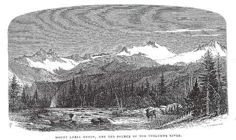 6月23日、隊はいよいよヨセミテ渓谷を出発します。いったんColutervilleトレイルを西に戻り、途中でMonoトレイルに入り、この日はPorcupine Flatまで進みます。ここは標高8,850ft.のロッジポールパインの林に囲まれた小さな平地で、蚊がかなり多いと記しています。しかし、シエラの大展望があり、Whitneyはそれらを14,000ft.級の山々と思い込みかなり興奮したようです。翌日はその西側の尾根をたどり、標高11,000ft.ほどの山に初登頂します。これはメンバーの名前をとってMt. Hoffmannと名づけられました。周りには標高12,000ft.を越える山々が50ほど見られ、それらのほとんどは雪を抱いたり、急峻な岩壁を持つ花崗岩の岩峰であるとBrewerは記します。そしてスイスアルプスほどに綺麗ではないが、その広大な荒涼さが特徴であろうとしつつも、”The scene is one to be remembered for a lifetime”とその印象深さは一生ものであると書き残しています。6月25日にはTenaya Lake湖畔にキャンプをし、26日にはTuolumne MeadowsのSoda Springsに入ります。この日近くでトレイルの探査をするために近くでキャンプしていたパーティから、南軍がペンシルベニア州に侵入したことを知らされ、一行はかなり落ち込んだと記しています[4]。ともかくもこの日の夜は快晴で、月明かりに照らされ周辺の山々が美しい風景を作り出していました。