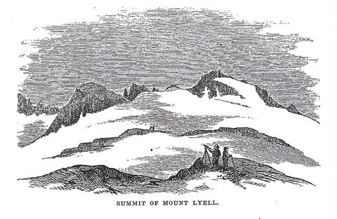 7月2日は早朝に行動を開始し、奥に見える最高峰を登りに出かけます。樹林帯をぬけ、昔氷河によって磨き上げられた岩の斜面を越え、あと高度差にして1,000ft.までに迫ります。そこからの斜面の雪は場所によっては柔らかく、2-3ftも潜り始めます。出発して7時間後、二人は頂上直下125〜150ft.に達するも突破できず、其処であきらめます。高度は13,000ft.付近を示していました。この山は、英国の地質学者の名を取り、Mt. Lyellと命名されます。
