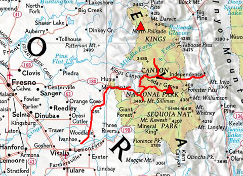 Hoffmann、Gardner、Brewerらが渓谷の南側を調査する間、兵士たちは、たった5マイルで4,000ft.も高度を稼ぐ急峻な北側の斜面を偵察し、Kings渓谷を抜け出すことが可能と思われるルートを発見します。一行はそれを辿り峠を越えて、次の測量地点として定めたMr. Goddardへと向かうべく、北側の渓谷Middle Fork Kings Canyonへの下降ルートを探し求めます。しかし、その急な斜面に荷物を持ったパックが通過が出来るルートは見つけることは出来ず、Kearsarge Passからのルートを使い、ひとたびシエラを東に越えて、北側から回りこみMt. Godderedを目指すことにします。Kings渓谷に戻った一行は、26日にBubbs Creek沿いのトレイルを辿り始めます。最初の1,500ftの斜面はかなり急で、所によっては馬やミュールを引っ張りあげなければなりませんでした。苦労をしながらこの日はBubbs Creek、Charlot Creek沿いに11マイルほど進み、翌日はKearsarge Passを越え、28日には灼熱のOwens Valley(Independence)に下りました。