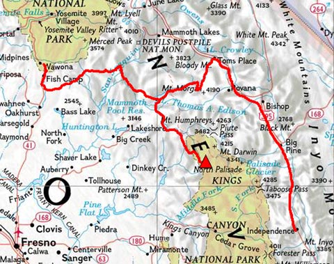 荷物が届き、6月17日にはいよいよ東へ向けて出発します。進路はおおむねKaweahとKings水系を分ける分水嶺に沿うもので、途中には数百本ものセコイアが見られます。Big Meadowsで数泊した後、6月28日は分水嶺上に聳える11,000ft.の山に登り、それをMt. Sillmanと命名します。その後Kings水系側の谷に下り、Roaring Riverを越え7月1日には、とある沢にキャンプを設営します。翌日BrewerとHoffmannは、沢の奥に聳えるピラミッド状の山(Mt. Brewerと命名)に登り、13,000ft.級の山々の連なるシエラネバダの主稜がさらに東にあることを発見します。戻ってきたBrewerとHoffmannの話を聞いたKingとCotterは、その一つの山(Mt. Tyndallと命名)を登りに出かけ、無事初登頂を成し遂げました。5日後二人が戻ってくると一行はキャンプ地を引き払い、エスコートのためにVisalliaからやってきた兵士たちの待つBig Meadowsへと戻ります。7月12日、Brewerは痛む歯の治療のため、Kingに付き添われ一時Visalliaへと山を降ります。其処からKingは別行動をとり、Mt. Whitneyへの登頂を試みるものの失敗、その後単独でWawonaへ戻り、Brewerらの帰りを待つことになります。